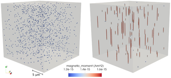 Aggregation procedure at concentration. The left picture shows the initial random particle positions, the right one shows the self-aggregated structure at . The magnetic field was . The particles are colourised by their magnetic moment values.