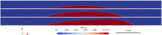 Another important setting is the boundary condition for the pressure at the fixed velocity boundaries, like at the wall. At the wall both phase velocities are zero; i.e., the total flux going through the wall should be also 0 at the new time step. In the original solver this is achieved by adjusting the pressure gradient boundary condition. This method’s modified version was used in our case. The formula of the total flux with is represented in the pressure equation, where its divergence is set to zero. Based on it, and the known value of the total flux at the boundary the pressure gradient is updated before solving the pressure equation.