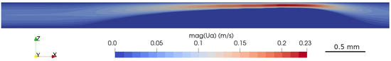 The magnetic field of the neodymium magnet was modeled with a modified version of OpenFOAM’s magneticFoam solver. We extended the code to work on a 2D axisymmetric mesh, as the field of the cylindrical magnet is axisymmetric. This way a higher mesh resolution was achieved with the same computational cost compared to a 3D simulation. The axisymmetric field was mapped to the microchannel using custom code, which was implemented using OpenFOAM’s interpolation classes. The interpolated field in the channel is shown in Figure 8. The magnet was positioned under the center of the simulation domain. The term was also calculated, which was needed to identify the magnetic force on the nanoparticle phase in Equation (20).