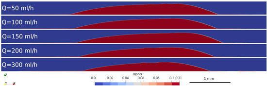 Simulations were made done at the other flow rates which were used in the measurements. The shapes at the different flow rates are shown in Figure 11. The values of the gap thicknesses are shown in Table 4. At the higher flow rates the gap is larger, as the increased drag force results in less nanoparticles to aggregate.