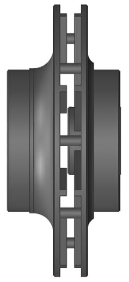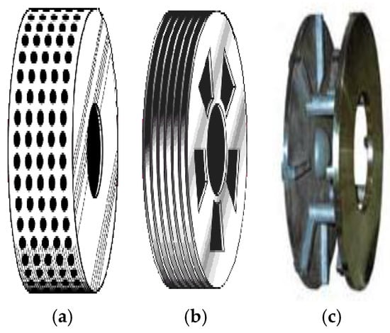 The initial basic idea concerning this specific pump device category is based on a simple first design invented around 1850 in the US (see Figure 1a). This first disc pump was built using a closed cylinder pierced by several holes to ensure flow rate. It operates solely on the boundary layer viscous drag principle. Around 1900, Nicola Tesla developed a new version that enables pumping of high-viscosity fluids using centrifugal effects between two small spacing corotating discs. This kind of device can generally pump a small amount of flow rate with small head coefficient compared with classical rotating centrifugal pumps. By adding several corotating discs (as shown in Figure 1b, so-called “Discpac” design, patented in 1988 [1]), one can only increase the flow rate, but there are still low head values. Based on the design considerations proposed by Cappelino et al. [2] and combined effects of viscous driven forces acting on tesla disc pumps, it is possible to design a specific tesla bladed pump impeller, using corotating discs equipped with small blade heights, which may reach higher flow rates and head values [3,4,5]. An example is given by a pump model tested by Yin [6], which is capable of reaching a total head of 120 m (of water) with a flow rate of 240 m3/h at 2900 rpm. These values can be obtained using an impeller outlet diameter of 0.32 m and purely radial straight blade shapes, as shown in Figure 1c. The maximum efficiency is generally lower than 50% due to the quite simple and crude impeller design characteristics.