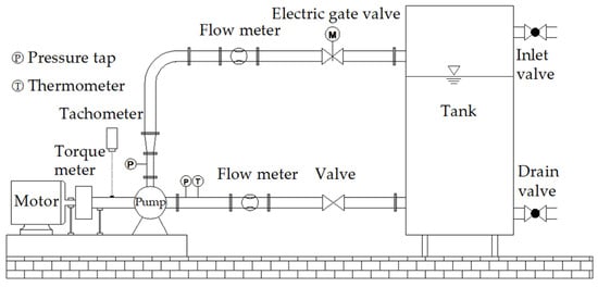 Figure 6 shows the test loop diagram with instrumentation. A tank (open to atmospheric pressure) with a volume of 3 m3 is placed to provide the recyclable fluid, valves are used to control the flow rate and two flow meters are placed upstream and downstream of the pump for flow rate evaluation. The use of the second flow meter concerns future experimental works linked to inlet two-phase flow conditions. Wall static pressure taps are placed in the front and outlet sections of the pump. Pump head is obtained by calculating the pressure difference between the wall static taps and adding the dynamic pressure assuming constant mean axial flow conditions at inlet and outlet pipe sections. Because of the high incidence angle, even for pump design conditions, TBD should be very sensitive to cavitation. Inlet pressure value is controlled to check possible inlet cavitation occurrence (see comments in Section 3.2). However, this topic is not included for the present analysis because the present test loop inlet tank is open to atmospheric conditions and does not allow inlet pressure control for cavitation tests.