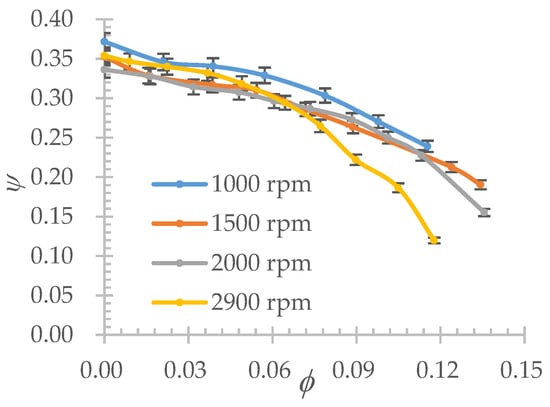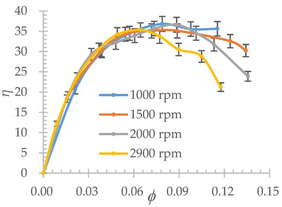 Figure 7 and Figure 8 respectively show the evolutions of the head coefficient and the efficiency versus flow coefficient for four different rotational speeds of 1000, 1500, 2000 and 2900 rpm. The definition of each coefficient is given as follows: