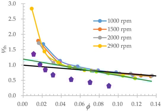 Theoretical head coefficient versus flow coefficient for four different rotational speeds (purple diamond symbols are extracted from the results published by Yin [6] for 2900 rpm).