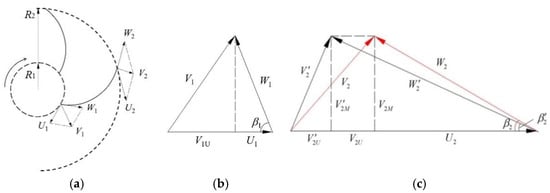 Velocity triangles: (a) blade to blade impeller flow channel; (b) inlet velocity triangle; (c) outlet velocity triangle.