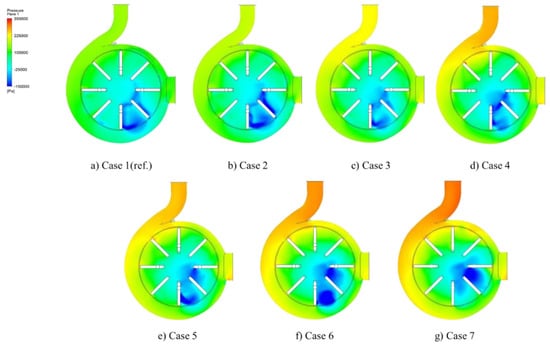 Figure 11. Example of numerical results on pressure distribution extracted from Je and Kim [11] for a given flow rate and different interblade clearance gaps. Interblade gap increases from Case 1 (large gap) to Case 7 (no gap, full blade height).