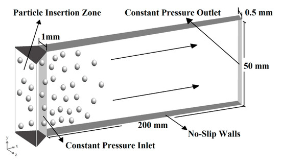 A sketch of the fracture geometry is shown in Figure 1. Its length and height are 200 mm by 50 mm while the inlet and the outlet width are 1 mm and 0.5 mm, respectively. The particles are created in the insertion zone and are carried by the drilling fluid to flow from the inlet to the outlet of the fracture. Researchers have investigated the appropriate grid cell to particle size in a fluidized bed simulation. Particularly, if the ratio of grid to particle size is smaller than 1.63, uncharacteristic behavior of the fluid–solid flow would be obtained due to incorrect calculations to satisfy the fluid properties [30]. The appropriate grid size is determined by the void fraction calculation from the coupled CFD–DEM. In this model, each grid cell is set to be 2 mm by 2 mm in length and height to ensure the accuracy and convergence of coupled CFD–DEM results. Fracture walls are rigid and assumed to have no-slip conditions, and both inlet and outlet are under constant pressure boundary conditions to represent wellbore and formation pressures, respectively. The fracture inlet is set at 875 KPa (127 psi) and the outlet pressure is set to be zero or basically formation pressure (if we assume that the inlet pressure is basically different pressure). The liquid phase is assumed to be Newtonian and incompressible. Gravity takes effect in the negative y-axis direction with the magnitude of 9.81 m/s2.