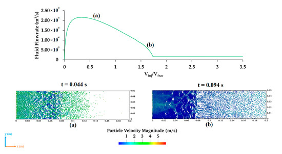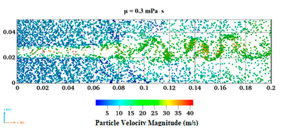 It is worth noting that the lowest fluid viscosity (0.3 mPa·s) displays turbulent flow. This explains the spikes in Figure 4a. A snapshot of such a situation is shown in Figure 6, where packs of particles are distorted and have swept the surrounding area. This turbulent effect dissipates when the distorted particle movement reaches the fracture inlet. The highest particle velocity magnitude exhibits as high as 40+ m/s, and the corresponding Reynolds number is around 7500.