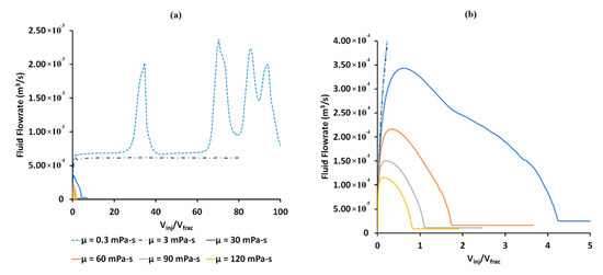 Flowrate at the fracture outlet for fluids with various viscosities. (a) Comparison of all six varying cases. (b) A closer look at the four most viscous fluids.