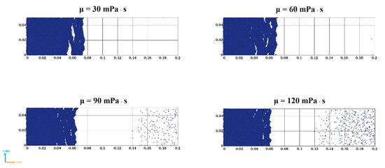 Fluid viscosity can be easily altered at elevated temperatures. As shown in Figure 4, six different cases of fluid viscosities have been simulated and studied. Two of the lowest viscosity cases fail to successfully seal fractures, which can be verified by the large amount of flow through the fracture, along with the large dimensionless volumes in Figure 4a. On the other hand, the other four higher viscosity cases lead to successful sealing results, as shown in Figure 4b. Higher fluid viscosity leads to a faster bridging as indicated by sealing in smaller dimensionless volumes, although their final bridging locations are relatively similar to each other (around 70 mm more or less from the inlet), as shown in Figure 5. All snapshots in Figure 5 are presented at the end of simulation where the remaining frontal particles, in higher viscosity cases (90 and 120 mPa·s), move relatively slower.