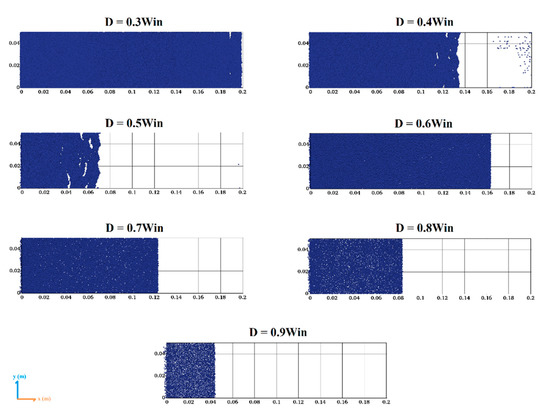 As mentioned before, size degradation plays a significant role to reach an effective sealing. It is the key that cost-effective designs must take into consideration; a proper particle size or a distribution of particles is required to effectively bridge and seal a fracture. Seven simulation cases of different particle sizes are run. The particle diameters range from 0.3 to 0.9 mm. These simulation results display the initial packing around the same dimensionless volume as shown in Figure 7. This is most likely due to having the same fluid viscosity. Flowrates peak at around . and decrease depending on how fast the complete seal is formed. Although successful results are obtained for all cases, the bridging and sealing mechanisms can be categorized into two types. For diameters equal or less than the fracture outlet, initial particle packing occurs in an island or islands inside the fracture. Then, the faster trailing particles collide with the slower frontal particles, resulting in the seal of a fracture. For diameters larger than the fracture outlet, only bridging occurs simply because the particles are not able to pass through the narrow end of fractures. It is shown in Figure 8 that the bridging front of each case situates closer to the fracture inlet as the particle size increases until its diameter becomes larger than fracture outlet. It is worth noting that the fracture outlet is at 0.5. Therefore, for larger diameters, 0.6 to 0.9 mm, bridging occurs at the location whose width is equal to particle diameter. The bridging by large particles results in insufficient packing where fluid can still flow through the interstitial void space.