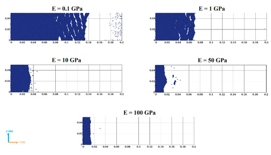 Particle elasticity or Young’s modulus can greatly affect its fracture sealing capability. Thermally exposed materials can be softened and have a reduction in their elasticity. Fluids with stiffer particles can result in earlier bridging and sealing, as shown in Figure 10 and Figure 11. Rigid LCMs with Young’s modulus of 10+ GPa bridge in a short period and form a seal close to the fracture inlet. Softer materials have a sealing position that is much different than the rigid ones, and their bridging locations are further out towards the fracture outlet. Such differences between the rigid and soft materials come from the fact that the LCMs undergo rapid collisions. Additionally, the softest material (0.1 GPa) experience the longest sealing period, whereas the most rigid material (100 GPa) bridge and seal in a very short time. During the transport process in the fracture, it is easier for the softer materials to bypass each other and penetrate deeper into a location inside a fracture.