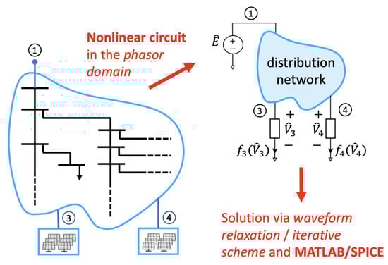 where and are the phasors of the node voltage and current, respectively, while and represent the real and reactive power absorbed by the node, respectively. The resulting nonlinear circuital equivalent can be also reinterpreted as shown in Figure 3c, where the linear and nonlinear blocks have been decoupled by means of controlled sources. This schematic is readily described in matrix form by means of the modified nodal analysis (MNA) formulation [].