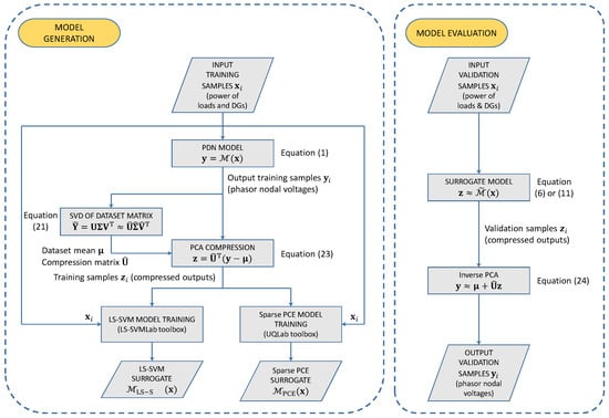 The flowchart of Figure 4 summarizes the main steps of the proposed methodology. For the model generation (left panel), a (limited) number of training output responses (in this case, phasor nodal voltages) are obtained from the full-computational model of the PDN for some random configurations of the input uncertain parameters (power of loads and DGs). These training responses are compressed using matrix , which is obtained by truncating the SVD of the dataset matrix according to the magnitude of its singular values. Finally, a surrogate model is trained for this reduced dataset. For the model evaluation (right panel), the process is reversed. A (usually large) number of samples of the uncertain input parameters is drawn. The surrogate model is used to inexpensively compute the corresponding compressed data. Finally, this compressed data is mapped back to the original data by applying the inverse transformation.