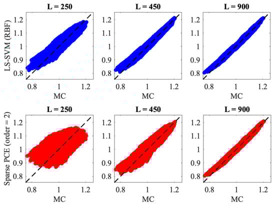 Figure 8 and Figure 9 provide a deterministic assessment for Case 1 and Case 2, respectively, by showing the correlation between the reference outputs from the MC simulation and the corresponding predictions obtained with the LS-SVM and PCE surrogate models for an increasing number of training samples. The best model is the one in which the cloud of points lies along the diagonal (black dashed line). A good correlation is observed for both the LS-SVM and PCE models with for Case 1 and for Case 2. In this case, the two surrogate models provide comparable accuracy. When using smaller training datasets instead, the LS-SVM model exhibits superior accuracy, while a larger error is observed for the PCE model. This could be explained by the fact that the PCE is not primarily intended for parametric modeling, since it allows a large error for unlikely samples, as discussed in Section 4.2. Indeed, scatter plots assess the accuracy of the model in reproducing the system behavior for a wide range of parameter configurations, disregarding their actual probability of occurrence.
