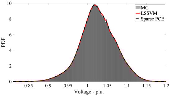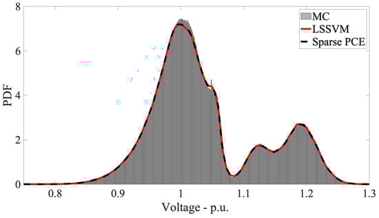 Figure 10 and Figure 11 provide instead a probabilistic analysis. The PDFs of the ensemble of all nodal voltages (i.e., all the entries of the output vector ) calculated from 10,000 MC samples (gray bars) are compared to the predictions obtained with the proposed PCA-compressed LS-SVM (solid red curve) and sparse PCE (dashed black curve) surrogate models, both of which provide excellent accuracy. A notable effect on the distribution shape, due to the additional set of uncertain parameters included in Case 2, is observed. The results highlight the capability of both surrogate models of accurately providing the statistical information about the expected distribution of nodal voltages for such a heterogeneous situation described by the presence of a large variability in the load and DG power. This statistical analysis is extremely helpful since it provides a single global picture on the possible critical behavior of the network, at least in terms of the values of the nodal voltage magnitudes in the lower and in the upper part of the distribution. A similar assessment can be done by considering other sensitive parameters such as the phase of the nodal voltages or the branch power, using the same modeling methodology.