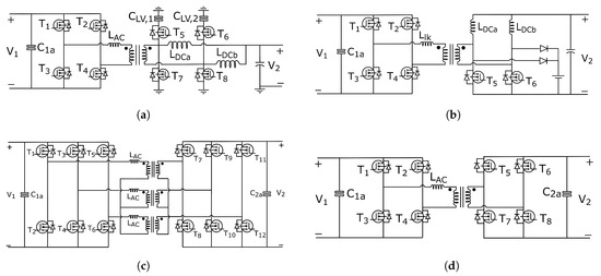 Schematics of the topologies considered in this study. (a) Active Bride Active Clamp; (b) Current Doubler; (c) Three Phase Dual Active Bridge; (d) Dual Active Bridge: Phase Shift and extended Triangular-Trapezoidal [12] modulations.