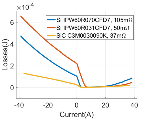Figure 4 compares curves of switching losses as a function of load current for a half bridge for the three switches in Table 1. Those curves have been calculated for nominal voltage and at a constant current load. Positive currents indicate positive Drain to Source current in the turn-off. The considered constant current load is a reasonable approximation of the practical scenario provided by the AC inductor of the converter. This approximation is specially accurate for DAB topologies, which usually have large AC inductances.