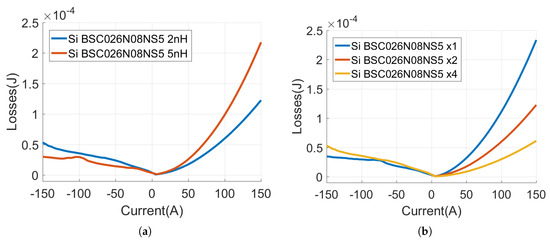 Stray inductances of LV switches layout has an important impact in LV switching losses [34,35,36]. In this study we have considered the impact of source inductance and drain inductance. Each inductance accounts for both the package inductance, and the impact of layout. In the case of the source inductance, we must differentiate common source inductance (source parasitic inductance that is part of gate drive loop [34]) from total source inductance. In Figure 5a we show the impact of varying source and drain parasitic inductances in a half bridge made of two paralelled MOSFETs. These results have been obtained by simulation with PSPICE. Drain and source inductances refer to layout inductances (external to package) per paralelled MOSFET. An external constant common source inductance of 0.3 nH per MOSFET is included in both simulations. It can be observed that layout inductances have a significant impact in switching losses. In particular, low layout inductances of 2 nH lead to a significant reduction in switching losses for positive drain to source turn-off currents, compared to 5 nH layout inductances. Although the 5 nH layout yields slightly lower losses for negative drain to source turn-off currents, we can conclude that the 2 nH layout outperforms the 5 nH layout. Therefore, external drain and source parasitic inductances of 2 nH have been considered for the efficiency evaluation carried out in Section 3. Regarding this aspect, it is worth mentioning that we have also checked that low common source inductance leads in most cases to low switching losses (results not shown).