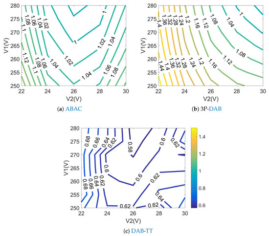 In the LV side, filter structure depends on topology. For example, no additional LV filter components are required in CD. In ABAC, only LV HF capacitors are included in the “LV filter” weight in Figure 12a. On the other hand, the weight of the filter at the LV side for the 3P-DAB topology is 2/3 times that for single phase DAB topologies.