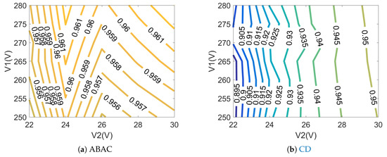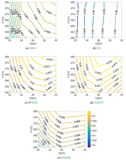 Since in most converter operating scenarios converter control will regulate output voltage to its nominal value, it is interesting to analyze, for each topology and for the output voltage fixed to its nominal value, how efficiency varies with output power and with input voltage. Figure 9 and Figure 10 represent contour plots of efficiency when output power goes from half power to its nominal value for input voltages within the (,) range specified in Table 3.