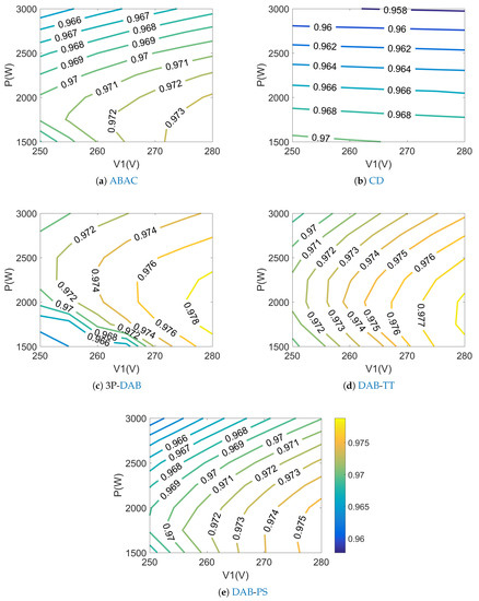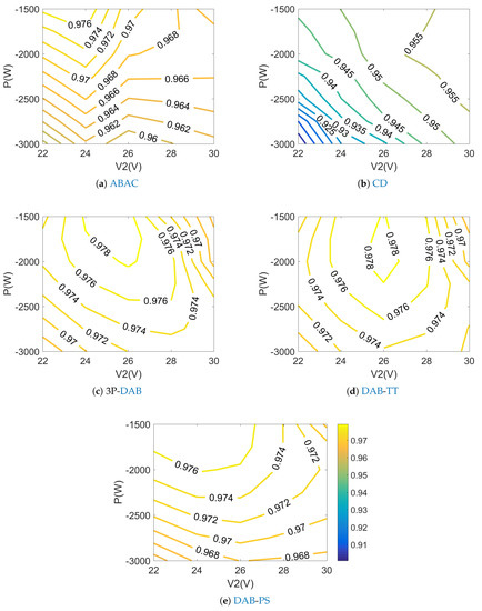 From the buck mode efficiency maps shown in Figure 9 it can be observed that the highest efficiency values are achieved by three phase DAB and DAB with TT modulation. Then, DAB with PS modulation and ABAC follow them, whereas CD yields the worst peak efficiency. Also, it is interesting to note that ABAC and CD have similar efficiency patterns in the sense that for a given input voltage V1, efficiency decreases at higher powers. On the contrary, for the CD topology, efficiency dependency with power is negligible. For DAB topologies, efficiency increases as the input voltage increases, with a maximum at a power value between the nominal power and half power. Maximum and minimum efficiencies extracted from these graphs are summarized in Table 7. This table also displays efficiency variation in buck mode. Results in Table 7 show that DAB-TT has the best performance, whereas the CD topology has the lowest efficiencies. However, there are no significant differences in efficiency variations between topologies.