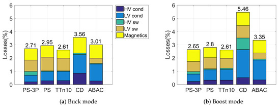 A comparison of Figure 11a,b reveals that for most topologies there exist no significant difference between average efficiencies when comparing buck and boost modes of operation. An interesting exception is the CD topology. This topology shows a significant asymmetry in performance with power direction that can be explained by the important difference in waveforms when only power sign is changed. For example, the factor of two in HV conduction losses in CD is explained because HV rms currents are much larger in buck mode than in boost mode. On the other hand, ZVS in HV MOSFETs is achieved only in buck mode, which explains the significant difference of in HV switching losses between buck and boost modes. We can also observe that in buck mode, LV switching losses are negligible, while in boost mode they contribute in to average losses. This is accounted for by the fact that there is soft switching in LV switches both at turn-on and turn-off in buck mode. By contrast, in boost mode hard turn off occurs.
