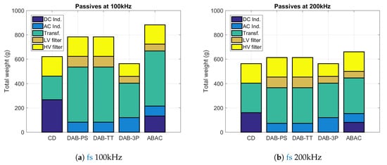 Since power density is one of the main constraints in the design of power converters for aeronautical applications, it is convenient to compare expected weights of the five topologies analyzed in this work. Figure 12 shows such a weight comparison for the 100 kHz design (Figure 12a) and the 200 kHz design (Figure 12b). In those bar graphs the total weights are broken down into the contributions of the different passive elements that we have considered in this study. Regarding this, the “DC ind.” label stands for the contribution of the DC inductors that are required for topology operation in CD and ABAC topologies. “LV filter” and “HV filter” labels refer to high frequency capacitors required for the DC links that interface bridges, and OTS DC inductors added for extended control and filtering purposes. Finally, labels “Transf.” and “AC ind.” make reference to the contribution of the transformer and the AC inductors. Those components, together with DC inductors in CD and ABAC, are custom magnetics. Design criteria of these components have been expounded in Section 2.3.