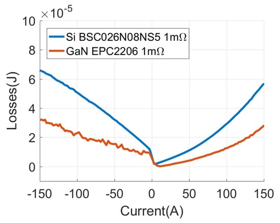Simulated switching losses of four paralleled GaN (EPC2206) and Si (BSC026N08NS5) MOSFET, at 28 VDC.