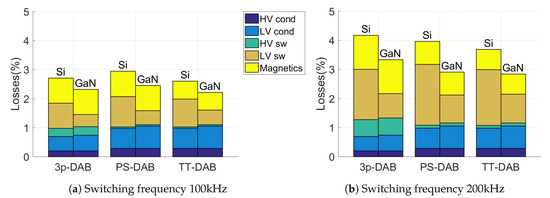 In Figure 14a we can see graphically that implementing GaN switches in the LV side leads to only 0.4% efficiency increase compared to the Si solution, due to lower switching losses of the GaN proposed switches. In Figure 14b we can see that doubling switching frequency has an important impact in converter average losses: 1.5% more losses in 3p-DAB and 1.1% more losses in single phase DAB designs. When switching frequency is doubled, both LV and HV switching losses are doubled, and magnetics losses change as well, according to manufacturer loss models. In particular, LV switching losses are the loss component that penalizes doubling switching frequency. Doubling switching frequency involves an efficiency decrease of roughly 1%, only due to the increase of LV switching losses, for the chosen Si MOSFETs. Under this scenario, the use of GaN switches becomes an interesting technology from the efficiency point of view.