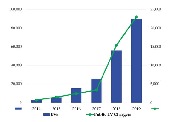 With the worldwide spread of eco-friendly policies that regulate emissions of internal combustion engine vehicles and encourage their replacement, the electric vehicle (EV) that consumes renewable electric energy is gaining international attention and its market is rapidly growing. In Korea, the government promotes the popularization of EV through purchase subsidies, and as of 2019, totals of 89,918 vehicles and 23,012 power chargers were introduced as shown in Figure 1. According to the government’s roadmap for the development of the EV industry, it aims to increase the share of domestic automobile demand to 14.4% by increasing the number of EVs to about 250 k by 2025.