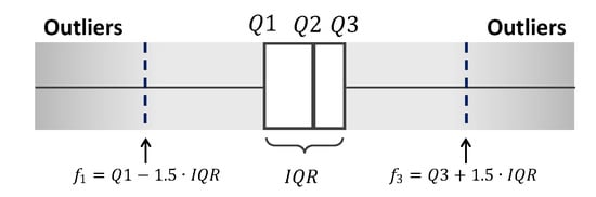 The denominator of OMC () represents the maximum possible amount of charging within a give charging time. Therefore, for normal data, OMCs should be 1 or less. However, instead of removing all cases where OMC exceeded 1, we take into account minor measurement errors and apply outlier detection based on interquartile range (IQR), , where is the third quartile (75%) of the measured OMCs and is the first quartile (25%). Based on IQR presented in Figure 2, outliers are defined as cases where OMC deviates from or by . Therefore, the upper bound () and the lower bound () for determining whether or not an outlier are defined as follows: