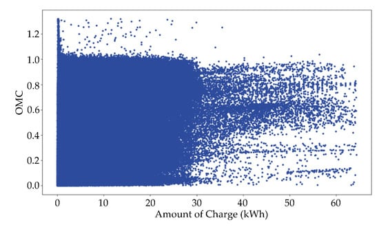 Even with refined data that satisfies the validity, if there are a number of extreme outliers, it can distort the learning of the forecasting model and impair performance. Therefore, if the amount of charging is extremely small or large considering the charging time, it is treated as an outlier that should be removed from the dataset. As a metric for determining whether or not an outlier, the ratio of observation to a maximum amount of charging (OMC) is defined as follows: