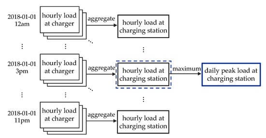 Before building a forecasting model, it is required to extract features that compose a training set from observations. Figure 4 shows the measurement of the daily peak load, which is the target variable of the forecasting model. Basically, a charging station operates multiple chargers, and the EV dataset consists of charging records collected from the individual chargers. Since the time intervals of these data recorded in an event-driven manner are not constant, it is mandatory to integrate the time series into a uniformed time granularity before constructing a forecasting model. In this regard, all load values are resampled into hourly loads and then an hourly charging station load is measured through the aggregation of hourly loads of chargers operated in a charging station. Consequently, the maximum of the measured hourly charging station loads is taken as the daily peak load of the charging station.