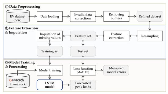 The concerns of this paper are two-fold. One is the development of a load forecasting model for EV charging stations using LSTM neural networks. The other one is the handling of missing values in the given dataset to let the forecasting model be more accurate. Regarding these concerns, the forecasting model is developed according to the procedure in Figure 5 and the following is a detailed description of each step.