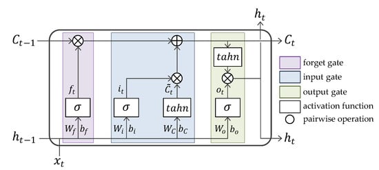 As shown in Figure 6, an LSTM cell is a basic unit of LSTM networks and takes three elements as inputs. First, is a input vector at the time step t. Second, is the internal state of the LSTM cell at the previous time step. As long-term stored information, it is continuously updated during the process of passing onto successive LSTM cells. Lastly, is the hidden state at . As the output of the last cell, it is delivered to the next cell and the adjacent LSTM layer. Three gates in the LSTM cell process these inputs to obtain an updated cell state and new hidden state .