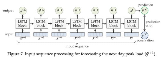 Based on the LSTM model, we develop a daily peak load forecasting model which takes a sequence of features for 7 days as inputs () and then predict the next day peak load () as shown in Figure 7. A prediction error is measured by differencing with , an observed target value at time step .