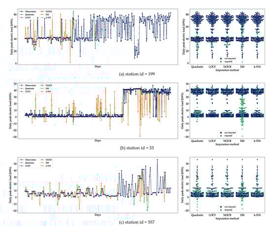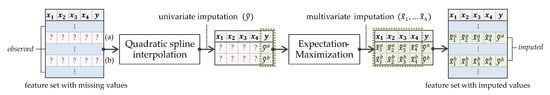 As described above, the training set consists of daily features resampled from the original EV dataset. In cases of charging stations with low data frequency, missing values are inevitably generated after the resampling process. In order to handle these missing values, we devise an imputation approach that combines the spline interpolation and EM algorithm; that is, the quadratic spline function first interpolates the missing values of the target variable (daily peak load). Next, the EM algorithm performs multivariate imputations on other features using the estimated target values as predictors. The reasons for devising the two-stage imputation approach are as follows. First, since missing values in the training set result from the resampling, on days when there is an absence of any charging events, all feature values except the charging station ID and day of the week are missing ( and y in Figure 8). This means that the use of the multivariate imputation alone, which requires some of the observed values in a data instance, is not reasonable. Therefore, we use the spline interpolation method to construct target values of the missing part in a smooth shape instead of using EM or k-NN. Second, the other features (e.g., the amount of normal charging per day) have strong correlations with the target variable. Therefore, it is rational to perform multivariate imputation for the other features using the estimated target variable as a predictor (). If the spline interpolation is used solely, the missing values of each feature are imputed regardless of the correlations. Thus, we use the EM algorithm as a multivariate imputation method in the second stage of imputation.