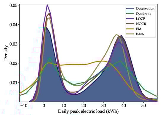 In this paper, we proposed an LSTM-based prediction model for daily peak load forecasting of EV charging stations. In addition, in order to mitigate the degradation of forecast accuracy due to missing values, we devised an imputation method appropriate for the EV charging dataset. Similar to the previous study [], the EV dataset has the dominant type of missingness, indicating that, for instances in which the missing occurs, the values of all variables that could be predictors for other variables are missing. For this, our imputation approach, QEM was designed to first construct the values of the target variable though the quadratic spline interpolation, and then perform multivariate imputation by EM using the estimated target values as predictors to fill the remaining variables.