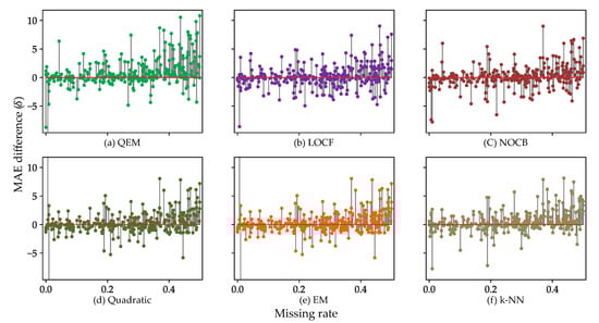 Figure 11 shows the comparison of of all charging stations using the training set with . Through the measured values of , it is verified that all the imputation techniques are superior to NI since they all resulted in more positive values of than negative ones. Overall, charging stations with low missing rates show that the effect of imputation is unclear, or even in some cases, the imputation results in worse performance. On the other hand, as the missing rate increases, the imputation models output a positive in many cases, and the magnitude of also surges. In particular, for charging stations with a high missing rate, QEM tends to achieve a greater performance improvement compared to the rest of the models including NI. This indicates that QEM is the most effective imputation method as the training set contains more missing values.
