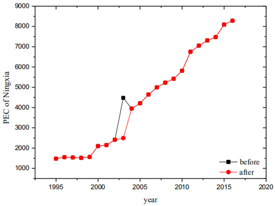 For the Ningxia Hui Autonomous Region, the per capita energy consumption in 2003 is revised to 2490.53 kce/person according to the half-life cycle equation with data from 1997. The data change condition after the correction is shown in Figure 3.