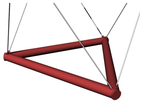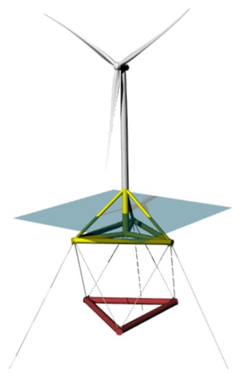 Lastly, the keel suspension lines and mooring lines are also connected to the radial braces outer nodes. The keel consists of three tubes connected together to form a triangular shape and is suspended below the floater with six suspension lines.