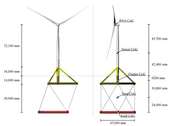 In general, the floater consists of ten individual components, distributed among four unique structural elements. The naming convention for the components of the floater is given in Figure 4. These elements are terminated in cast nodes and conically tapered where applicable. All nodes are connected with shear loaded pin connections in order to mitigate the risk of possible errors in works related to bolt tensioning. The overall description of the floater is presented in Table 4, while the definition of the position and properties of each component is listed in Table 5. The conically tapered ends are converted into constant cylinders providing similar buoyancy of the entire element. The floater is equipped with boat landing, platforms, wind turbine components, etc., all included in the mass defined in Table 4.