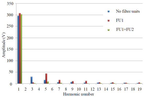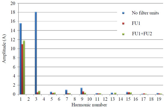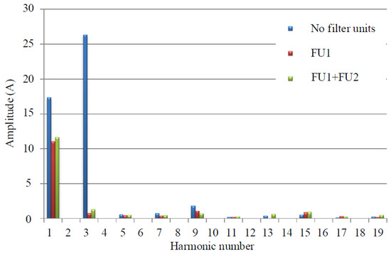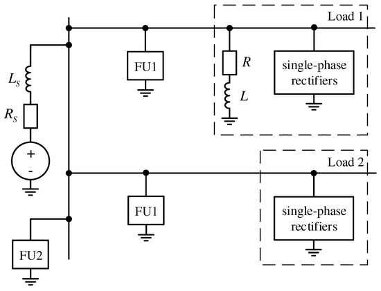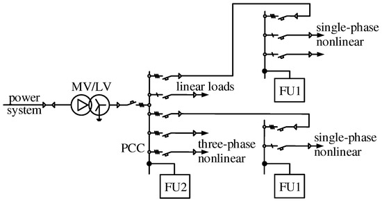 Filter units 1 are installed at the points of common coupling with nonlinear loads. FU1 are implemented by a passive high-pass filter and a single-phase inverter. A shunt hybrid filter with voltage feedback is used as FU2.