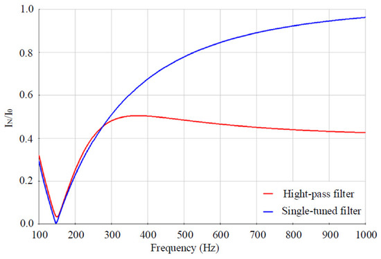 Figure 6 shows the frequency characteristics of the zero sequence current transmission coefficients when using single-tuned and high-pass passive filters. The parameter of the active filter is