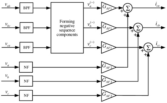 Figure 13. The signals proportional to network voltages at the PCC are applied to the inputs of band-pass and notch filters (BPF and NF in
