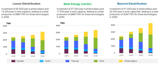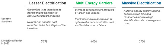 The analysis is based on two levers of the energy transition: the decarbonization of energy vectors (electricity and other fuels) and the electrification rate of energy end uses. For other levers, it is simply assumed that without further elaboration, energy conservation is fixed (and taken at ambitious levels [8,24]). Carbon dioxide removal from energy related emissions is also excluded. This assumption is important as this technology can influence the results considerably. The assumption does not reflect any ex ante judgment on this technology—It derives from the object of this study, which was to analyze the 100% renewable transition. Substitution at the level of useful energy demand is driven by the scenario storylines and completed by a competitiveness analysis based on commodity prices and measures, e.g., in terms of total cost of ownership for vehicles (representing the total discounted cost for the vehicle owner, including purchase price, tax, insurance, maintenance, fuel operating cost and resale value) or levelized cost of heating for space heating technologies (measuring the average cost of heating in €/MWhth over the lifetime of the heating installation). Deployment and stock replacement constraints set bounds on these substitutions. Additional efficiency gains depending on used energy carriers are also introduced, notably for heating technologies (electric heat pumps, condensing boilers, etc.) and transport (combustion engine, fuel cell, electric motors).