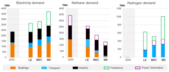 CW–E electricity, methane, and hydrogen demand by final and secondary uses in 2050 (and 2020 as reference) (TWh).