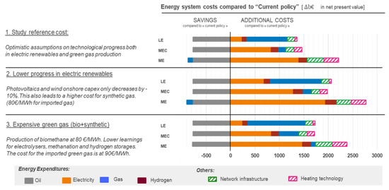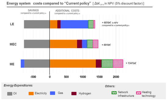 Figure 3 provides the economic evaluation of the scenario in terms of net present value (NPV) of the energy system cost compared to a current policy scenario. The computation is based on a 5% discount rate and the 2050 values were taken as final steady state situation. It compares the increase in energy expenditures per carrier in cost for network infrastructure (taken from Agora [32] regarding integration of renewables) and in technologies for space heating.