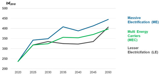 Decarbonization, in this model, is driven by CO2 curves constructed by a short iterative process to satisfy a linear pattern of decarbonization through the horizon with full decarbonization in 2050. This indirect procedure is preferred to the one that directly imposes a sequence of decarbonization profiles as it avoids perturbations of dual variables due to overlapping constraints, some of them reflecting EU policies. Because the evolution of the system is constrained by the electrification and green gas policy, the CO2 curves are expected to be different. This is the case close to the horizon given the need to arrive at full decarbonization (Table 3). This arises when natural gas is displaced from the system, which is in the last period of the horizon (an outcome of the intertemporal optimization) and is eliminated using different technologies in the ME, MEC, and LE scenarios. Domestic bio and synthetic methane in ME implies a CO2 price of 354 €2018/t. Import of synthetic methane until saturation of infrastructure and local synthetic methane makes the CO2 price, at 399 €2018/t in LE higher than in ME because of less favorable integration of electrolyzers in the power sector. MEC can import synthetic gas at 227 €2018/t through unsaturated infrastructures. Fixing the decarbonization objective through a 2050 CO2 price ensures a total conversion to renewable in that year, making this a normative scenario analysis.